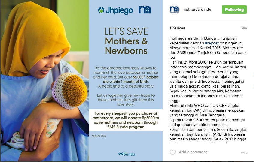 Dengan kita melakukan pembelian sleepsuits di Mothercare, maka kita akan mendonasikan Rp. 5.000 untuk kampanye angka kematian ibu dan bayi di Indonesia yang tinggi melalui program SMS Bunda.